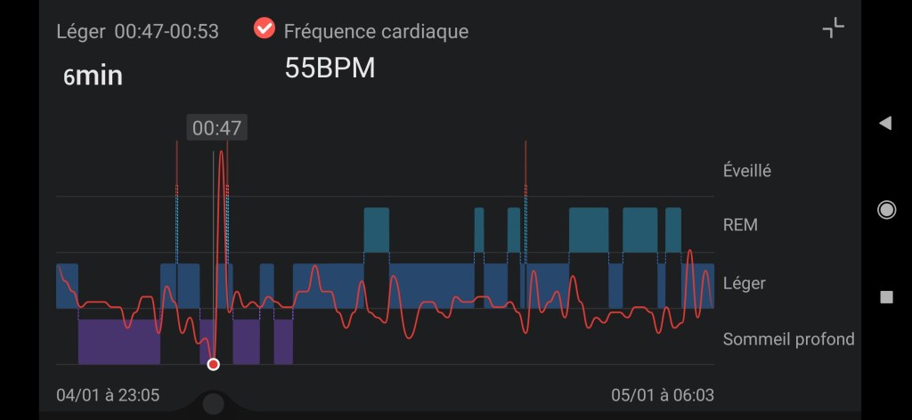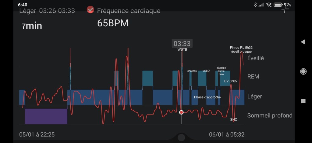 Depuis quelques jours on m’a prêté une de ces montres à la mode, et par curiosité j’ai pris des mesures nocturnes. Celles de ce matin étaient intéressantes dans la mesure où en début de nuit je suis parti en RL, ce qui est très rare pour moi de cette manière, car ça se passe toujours après un WBTB en fin de nuit, et l’intention d’une projection via la focalisation soutenue sur les images autonomes… Le RL a donc été fait spontanément en première partie de nuit, dans un intervalle de 10mn, de 0H37 à 0H47, avec un endormissement notifié à 23H20.